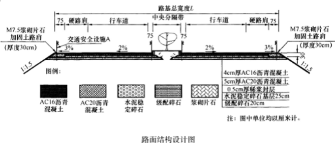 某施工单位承接了平原区-段长60.5km的双向四车道新建高速公路路面施工。该高速公路设计车速为100km/h,全线均为填方路堤,平均填方高度1~2m。硬路肩宽3m,中央分隔带宽2m,单车道宽度3.75m,土路肩宽0.75m(采用M7.5浆砌片石加固)。路面面层采用AC16沥青混凝土,全线没有加宽与超高。行车道、硬路肩、路缘带均采用相同的路面结构尺寸,路面结构设计图如下图所示:
