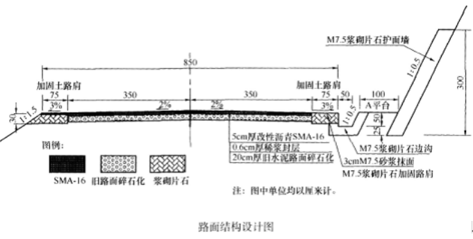 某施工单位承接了长67.8km的二级公路旧路面“白改黑”改建施工,旧路面为水泥混凝土面层,使用9年后面板破损严重,主要的病害有:裂缝、断板、板底脱空。设计院现场勘察后认为必须重建,设计院进行了旧路改建设计,设计要求将旧路面做碎石化处理,加铺SMA面层。在右侧岩层破碎的挖方路段增设了护面墙和1m宽的A平台。路面结构如下图所示。