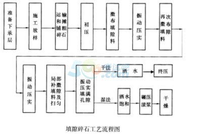 此题考查路面粒料基层(底基层)施工技术。填隙碎石施工分干法施工和湿法施工两种,其工艺图如下: