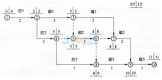 挖3工序的总时差=箭头点最迟-箭尾点最早-本工序持续=9-5-1=3。