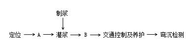 施工单位采用直接加铺法施工。对破损严重的板块进行凿除,并重新浇筑水泥混凝土板:对脱空板、不均匀沉降板采用如下工艺流程进行处理: