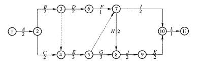 某建设工程土建施工项目双代号网络计划如下图所示,该工程工期为15个月,在该施工进度网络计划中,工作B, E, I均为土方工程,土方工程量分别为5000m3 ,7500m3 , 5500m3共计18000m3,土方单价为18元/m3。在合同中规定,当土方工程量增加超出原估算工程量10%时,新的土方单价可从原来的18元/m3调整到16元/m3。在工程进行2个月后(此时工作A已完成),业主提出增加一项新的土方工程M,该项工作在工作E结束以后开始,并在工作F开始前完成,工作M的土方工程量约为6000m3,施工时间需要2个月。根据施工组织的安排,工作B, E, M, I使用同一台施工机械,并按上述工作先后顺序施工。现承包商提出由于增加土方工程M后,增加了施工机械的闲置时间,要求索赔施工机械的闲置费用和工期索赔,机械闲置费用为700元/天。