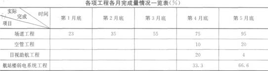 1)场道工程:第1月超额完成计划任务,第2月没有完成计划任务。第3月、第4月、第5月的实际完成量与计划完成量相符。
