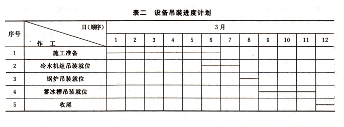 在吊装方案中,绘制了吊装施工平面图,设置吊装区,制定安全技术措施,编制了设备吊装进度计划(见表二)。施工单位按吊装的工程量及进度计划配置足够的施工作业人员。