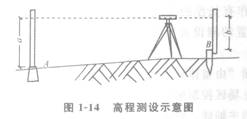 【答案】C本题考核的是地面上点的高程测设。在进行施工测量时,经常要在地面上和空间内设置一些给定高程的点。如图所示,设B为待测点,其设计高程为HB,A 为水准点,已知其高程为HA。为了将设计高程HB测定于B,安置水准仪于A、B之间,先在A点立尺,读得后视读数为a,然后在B点立尺。为了使B点的标高等于设计高程HB,升高或降低B点上所立之尺,使前视尺之读数等于b,则b=HA+a-HB。因此,HB—HA+a-b。