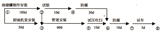 该公司项目部根据劳动力资源和施工机具的条件(主要是电焊工和焊机),优先安排储油罐制作安装,待完成后,再进行输油管网施工。储油罐安装采取液压顶升倒装法,焊前进行了焊接工艺评定。项目部制订的网络进度计划如下图所示: