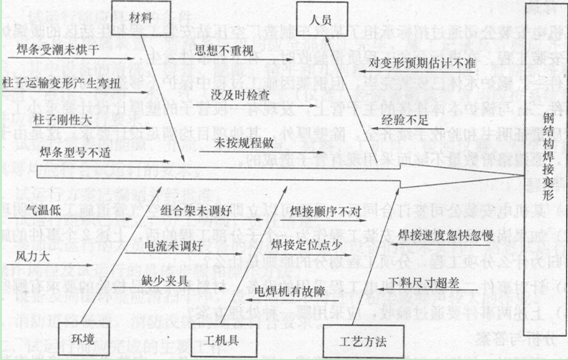 (4)质检人员发现油罐焊接出现变形问题,用因果图分析法分析造成构件发生焊接变形质量问题的原因,提出改进措施和对策。