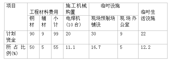 (2)背景材料给出钢材采购和预制场铺设资金比例为3Il,将增加的48万元(越野汽车42万元,手提电脑6万元)按此比例分解到计划项目(手提电脑资金列人现场办公室费用),钢材采购减少36万,预制场建设减少12万元。调整后见表。