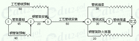2)将管线保温拆成2道工序,增加管线保温1,连接管线试压1与管线保温1,管线保温1与管线保温之间的2条逻辑关系线。重新分配管线作业时间:管线保温1(15天),管线保温(20天);