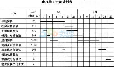安装公司项目部进场后,将拟安装的电梯工程,书面告知了电梯安装工程所在地的特种设备安全监督管理部门,并按合同要求编制了电梯施工方案和电梯施工进度计划表(见下表)。电梯安装采用流水搭接平行施工,安装人员配置有钳工、电工、焊工、起重工等。