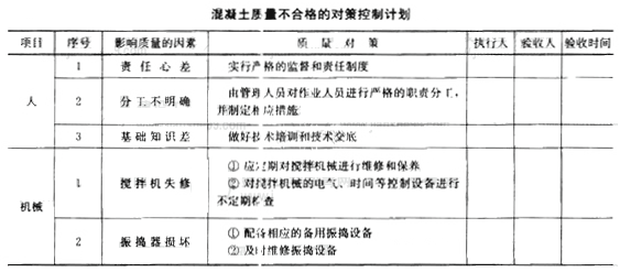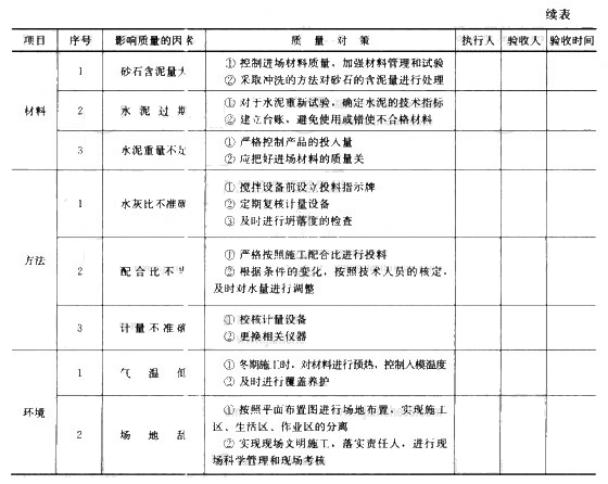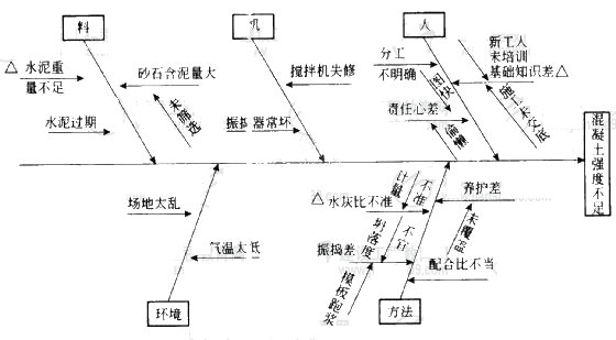 通过因果分析图,可以直观分析出造成混凝土强度不足的人、机械、材料、方法、环境等因素。并从众多因素中选择出影响大的影响因素(例如水灰比、养护等条件),在制定对策计划中应重点进行控制。