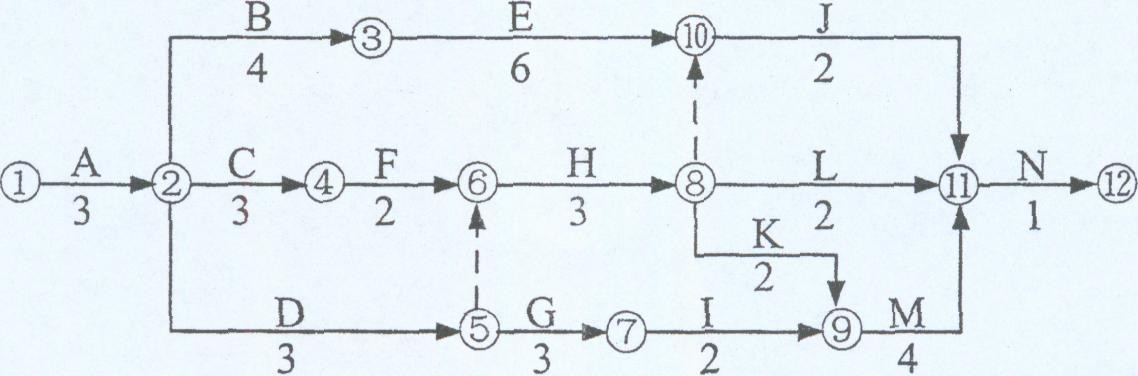 1.(本题3分)施工总承包单位提交的施工总进度计划的工期是18个月(1分)。该工程总进度计划的关键线路为①→②→④→⑥→⑧→⑨→⑾→⑿(2分)。