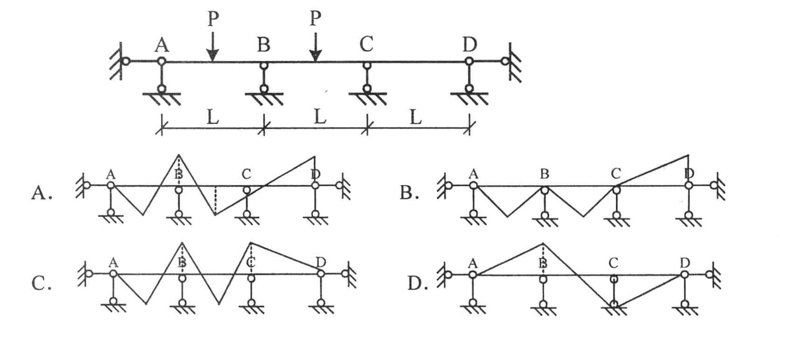 3、(0分) 有一连续梁,受力如图所示,则下列连续梁上的弯矩示意图中,正确的是( )。