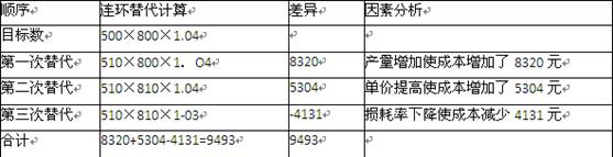 (5)各因素的影响程度之和=8320+5304-4131=9493元,与实际成本和目标成本的总差额相等。计算过程见下表: