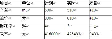 (1)分析对象为浇筑某层商品混凝土的成本,实际成本与目标成本的差额为9493元。
