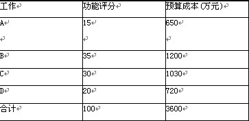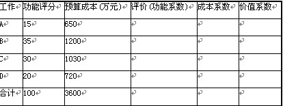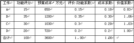 第35题 某施工单位承接了某项工程的总承包施工任务,该工程由A、B、C、D四项工作组成。由于施工场地狭小,为了进行成本控制,项目经理针对各项工作进行了分析,其功能成本分析表结果见下表。