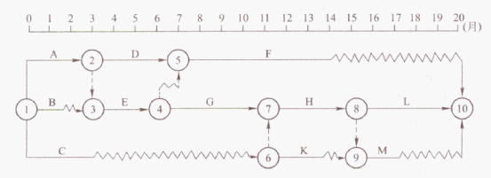 (4)此时,线路G—H—L工期缩减至10个月;工作F线路自由时差为6个月,压缩4个月后仍不会成为关键线路;线路G—H—M工期相应缩减至3+(2+2)=7,也不会成为关键线路,故此时的关键线路仍为G—H—L,整个工程总工期为6+10=16个月,正好弥补施工初期4个月的工期滞后,可满足业主提出的按原计划日期竣工的要求。