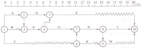(4)此时,线路G—H—L工期缩减至10个月;工作F线路自由时差为6个月,压缩4个月后仍不会成为关键线路;线路G—H—M工期相应缩减至3+(2+2)=7,也不会成为关键线路,故此时的关键线路仍为G—H—L,整个工程总工期为6+10=16个月,正好弥补施工初期4个月的工期滞后,可满足业主提出的按原计划日期竣工的要求。