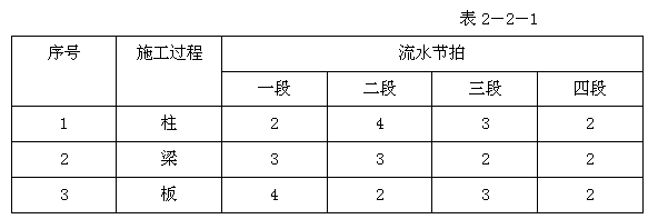 背景资料:某工程由主楼和塔楼组成,现浇钢筋混凝土柱,预制梁板,框架-剪力墙结构。工程拟分成四段进行流水施工,各段流水节拍见表2-2-1。