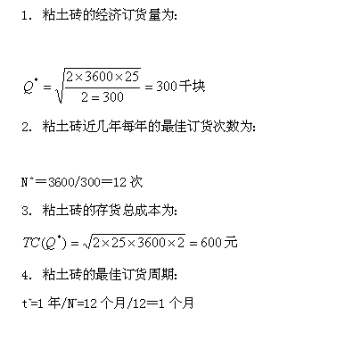 3、(0分) 背景资料:某项目自2000年至2005年,每年平均耗用粘土砖3600千块,单位存储成本为2元,一次订货成本25元。