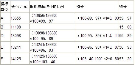 商务标共计60分。以标底的50%与承包商报价算术平均值的50%之和为基准价,但最高(或最低)报价高于(或低于)次高(或次低)报价15%者,在计算承包商报价算术平均值时不予考虑,且商务标得分为15分。以基准价为满分(60分),报价比基准价每下降1%,扣1分,最多扣10分;报价比基准价每增加1%,扣2分,扣分不保底。表79为标底和各承包商的报价汇总表。