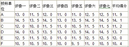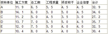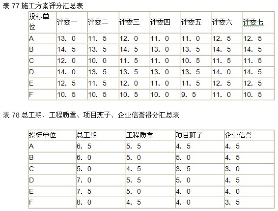 技术标共计40分,其中施工方案15分。总工期8分,工程质量6分,项目班子6分,企业信誉5分。技术标各项内容的得分,为各评委评分去掉一个最高分和一个最低分后的算术平均值。技术标合计得分不满28分者,不再评其商务标。各评委对6家承包商施工方案评分的汇总表及各承包商总工期、工程质量、项目班子、企业信誉得分汇总表见表77和表78。