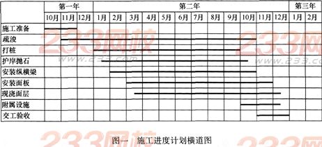 某海港新建顺岸式码头长802m,宽40m。码头岸坡、港池及航道疏浚工程量160万m3。岸坡土质为淤泥质黏土,设计坡比1:4,坡面为块石护面。码头采用φ1000mmPHC桩基础,现浇混凝土桩帽,上部结构为预制纵横梁及面板、现浇码头面层。本工程所有预制构件均由业主按需供应。