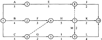 背景资料中给出了初始网络图,从图上可以看出,此网络图为双代号网络图。从初始网络图可知,工作C、工作H、工作J分别处于三条独立的线路上,相互之间没有关联。
