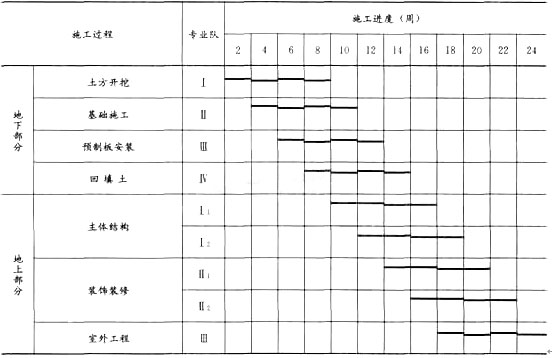 分析:地下部分最后的施工过程为回填土,回填土施工过程在四个流水段上的流水节拍为:2、2、2、2周,其中第一个施工段在第2周末结束后,即开始进入地上部分施工。