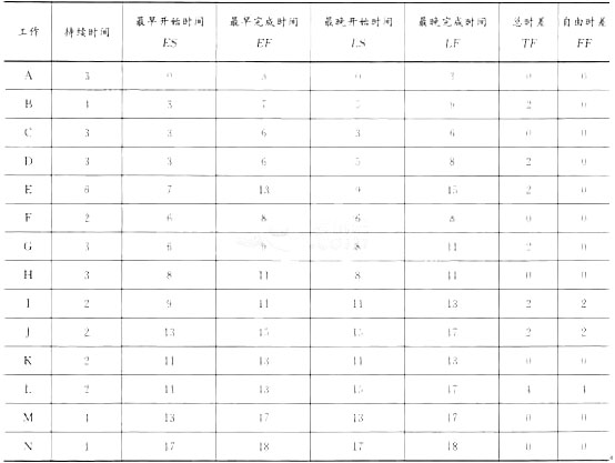 由上表可知,关键工作有:A、C、F、H、K、M、N。全部由关键工作连成的线路则为关键线路,由此,则用节点表示的关键线路为:①→②→④→⑥→⑧→⑨→⑩→11→12。