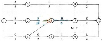 背景资料中给出了初始网络图,从图上可以看出,此网络图为双代号网络图。从初始网络图可知,工作C、工作H、工作J分别处于三条独立的线路上,相互之间没有关联。