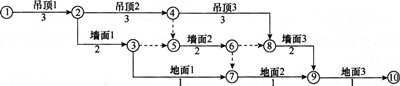 某住宅楼工程,地下1层,地上15层,建筑面积23520m2,框架一剪力墙结构,设计使用年限50年。地下1层为人防工程,工程由3个相同的单元组成。室内装饰装修施工范围为吊顶、墙面和地面3项工作。工程开工日期为2012年9月7日,计划竣工日期为2014年3月8日。施工单位在组织室内装饰装修工程流水施工时,按单元划分流水段,每单元吊顶、墙面、地面的计划工期分别为3周、2周、1周(每周按7个日历天计算)。网络计划图如下: