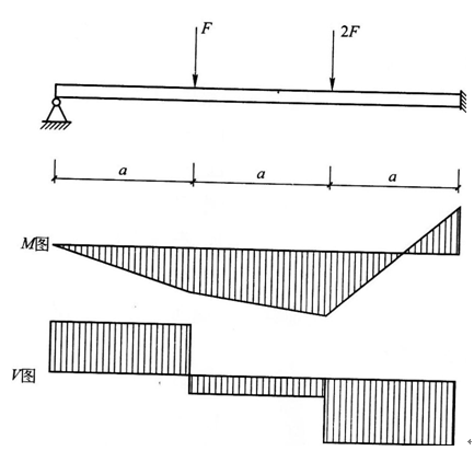 如图所示简支梁的弯矩图(M图)及剪力图(V图),各项说法中正确的是( )。