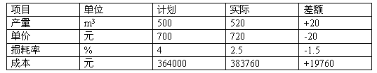 某混凝土工程,目标成本为364000元,实际成本为383760元。根据下表相关资料进行项目成本分析。 |