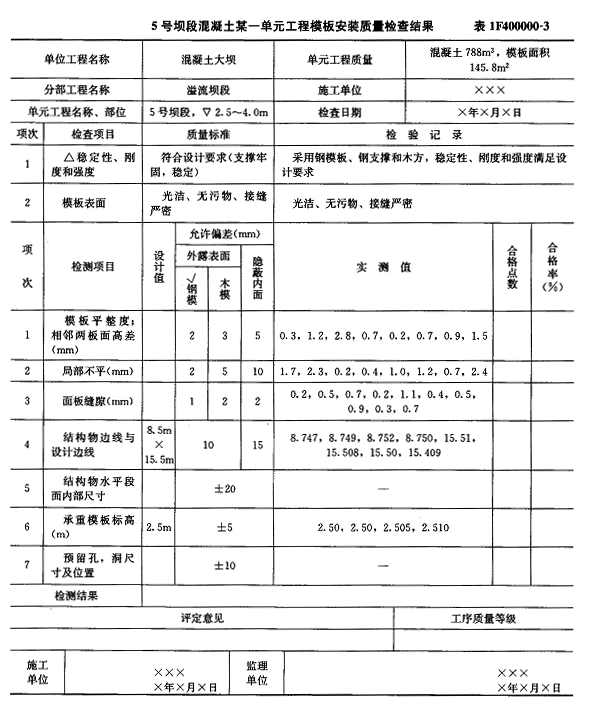 某承包商在混凝土重力坝施工过程中,采用分缝分块常规混凝土浇筑方法。由于工期紧,浇筑过程中气温较高,为保证混凝土浇筑质量,承包商积极采取了降低混凝土的入仓温度等措施。 在某分部工程施工过程中,发现某一单元工程混凝土强度严重不足,承包商及时组织人员全部进行了返工处理,造成直接经济损失20万元,构成了一般质量事故。返工放后经检验,该单元工程质量符合优良标准,自评为优良。 在该分部工程施工过程中,由于养护不及时等原因,造成另一单元工程坝体内出现较大裂缝和空洞,还有个别单元工程出现细微裂缝和表面裂缝。在发现问题后,承包商都及时采取了相应的措施进行处理。 在该分部工程施工过程中,对5号坝段混凝土某一单元工程模板安装质量检查结果如表1F400000-3。 ![]() 分部工程施工完成后,质检部门及时统计了该分部工程的单元工程施工质量评定情况:20个单元工程质量全部合格,其中12个单元工程被评为优良,优良率60%;关键部位单元工程质量优良;原材料、中间产品质量全部合格,其中混凝土拌合质量优良。该分部工程自评结果为优良。 问题: (1)在大体积混凝土浇筑过程中,可采取哪些具体措施降低混凝土的入仓温度? (2)对上述混凝土内外部出现的不同裂缝可采取哪些处理措施? (3)上述经承包商返工处理的单元工程质量能否自评为优良?为什么? (4)根据混凝土模板安装质量检查检测结果,指出该工序的施工质量等级并说明理由。 |