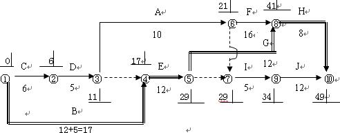 1.按A→D→I顺序组织施工,则网络计划变为图2所示: