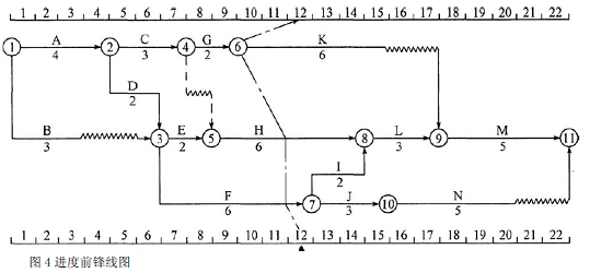 5.请在原进度计划中用前锋线表示出第12 月底时工作K、H 和F 的实际进展情况,并分析进度偏差对工程总工期的影响。