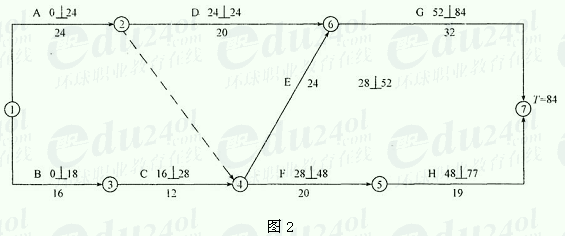 (1)先计算出计划网络图 2 各工作的最早开始时间、最早完成时间如图所示。