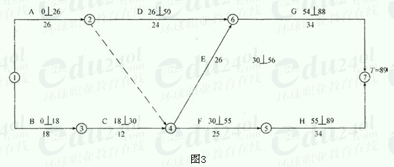 (2)计算出计划网络图3 各工作的最早开始时间、最早完成时间如图所示。所以,网络计划图2 的关键线路为①→③→④→⑤→⑦或由关键工作B→C→F→H 组成的路线,其计算长度为89 天。