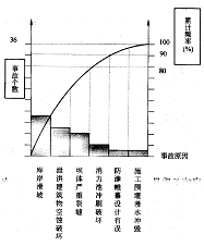 (2)累计频率在0%~80%,库岸滑坡、泄洪建筑物空蚀破坏、坝体严重裂缝是使这些水利工程大坝产生质量事故的主要原因;累计频率在80%~90%之间,消力池冲刷破坏为次要原因;累计频率在90%~100%之间,防渗帷幕设计有误、施工围堰漫水冲毁为一般原因。