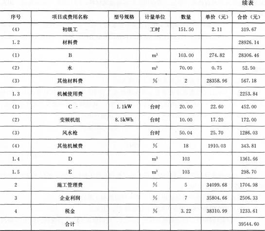 2.指出消力池混凝土单价分析表中,A、B、C、D、E所代表的名称。