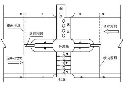 某平原区枢纽工程由泵站、节制闸等组成,采用闸、站结合布置方式,泵站与节制闸并排布置于调水河道,中间设分流岛,如图1所示。泵站共安装4台立式轴流泵,设计流量100m3/s,装机功率4×1600kW;节制闸最大过闸流量960m3/s。