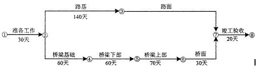 4.(本小题5分) 可行(1分)。因为桥梁基础施工所在线路为非关键线路,其线路时差为10天,(或回答调整后工期仍为280天也可)所以将基础施工定点是为70天,仍然不会改变网络工期(4分)。(若只回答不影响工期,则只给1分)