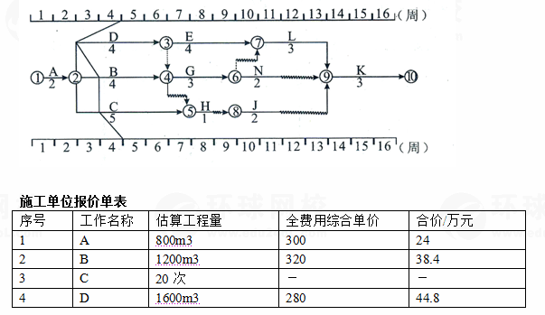 5、(0分) 背景资料:某市政公用工程的施工合同工期为16周,项目监理机构批准的施工进度计划如下图所示(时间单位:周)。各工作均按匀速施工。施工单位的报价单(部分)见下表。