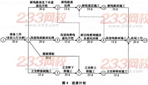 项目部组织有关人员编写了施工组织设计(其中进度计划见图4),并绘制了一张总平面布置图,要求工程从开工到完工严格按该图进行平面布置。