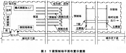 项目部进场后,拟在桥位线路上现有城市次干道旁租地建设T梁预制场,平面布置如图2所示,同时编制了预制场的建设方案:(1)混凝土采用商品混凝土。(2)预测台座数量按预制工期120d、每片梁预制占用台座时间为10d配置。(3)在T梁预制施工时,现浇湿接缝钢筋不弯折,两个相邻预制台座间要求具有宽度2m的支模及作业空间。(4)露天钢材堆场经整平碾压后,表面铺砂厚50mm。(5)由于该次干道位于城市郊区,预制场用地范围采用高1.5m的松木桩挂网围护。