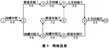 施工单位组织基槽开挖、管道安装和土方回填三个施工队流水作业,并划分了三个施工段,根据合同工期要求绘制网络进度图如图3所示。