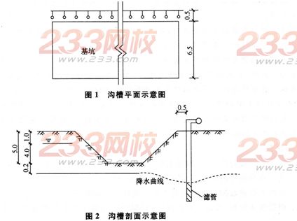 某施工单位承接了一项市政排水管道工程,基槽采用明挖法放坡开挖施工,宽度为6.5m,开挖深度为5m,场地内地下水位位于地表下1m,施工单位拟采用单排井点降水,井点的布置方式和降深等示意图如图1、图2所示。