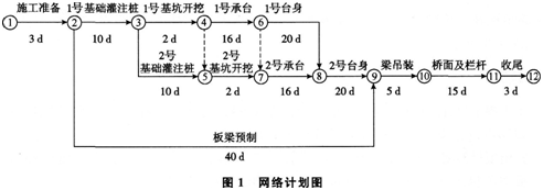 某市政跨河桥上部结构为长13m单跨简支预制板梁,下部结构由灌注桩基础、承台和台身构成。施工单位按合同工期编制了网络计划图(如图1所示),经监理工程师批准后实施。