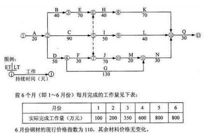 1.1-2-3-6-8-12-13是关键线路,计划工期270天2.列示计算预付款和起扣点的金额预付款=4000X10%=400万元,起扣点金额=4000*60%=2400万元,从第五个月开始扣(第五个月共有400+100+200+350+600+800=2450万元,超过2400万元),每个月扣200万 3.4月份进度款:是600*(1-5%)=570万元;5月份进度款:是800*(1-5%)-200=560万元 4.6月份的调价款 P=800*(0.6+0.2*110/100+0.1+0.1)=816万元 5.最经济的压缩方案为E压缩5天,H压缩10天,K压缩5天,共需费用=1+3+2=6万元。 6.可索赔费用,不可索赔工期。因为石质变硬不属于合同标明之内的,属于业主原因,故可索赔费用。但是由于G工作有总时差10天,而且,前面还提前了10天,即有20天时差可用,所以不影响总工期,故不可索赔工期。
